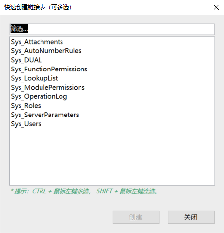 - 可一次创建一个或多个链接表,在列表中使用【Ctrl + 鼠标左键】多选,【Shift + 鼠标】左键连选。