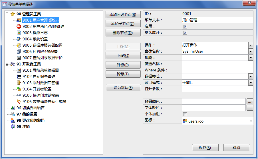 快速开发平台提供了功能强大的导航菜单编辑器,让你能随心所欲的对主界面中的树形导航菜单进行编辑。