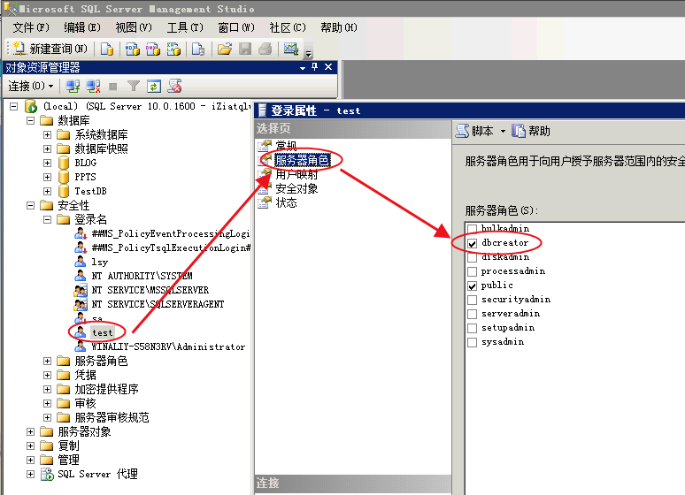 如果数据库不存在,需要新建数据库,必须先确保 SQL Server 用户名被指定为了 dbcreator 角色,否则数据库将无法创建成功,会导致升迁失败。
